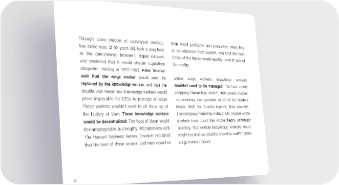 Through some miracle of clairvoyant intellect, their most profitable and productive when left this same man, at 80 years old, took a long look to do whatever they wanted, and that the best at the (pre-internet browser!) digital network CEOs of the future would quickly learn to accept and predicted that it would shatter capitalism this reality. altogether. Writing in 1992-1993, Peter Drucker said that the wage worker would soon be Unlike wage workers, knowledge workers replaced by the knowledge worker, and that the wouldn’t need to be managed* . “So how would trouble with these new knowledge workers would company hierarchies work?”, HBR asked Drucker, prove impossible for CEOs to manage or value. representing the question in all of its readers’ These workers wouldn’t need to all show up at heads. Well, Mr. Drucker replied, They wouldn’t. the factory at 9am. These knowledge workers The company hierarchy is dead. Mr. Drucker wrote would be decentralized. The best of them would a whole book about this whole theory, ultimately be unmanageable. In a lengthy 1992 interview with positing, that certain knowledge workers’ hours The Harvard Business Review, Drucker explained might become so valuable, they’d be worth 10,000 that the best of these women and men would be wage workers’ hours. 40