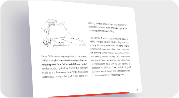 ordering all kinds of beverages and snacks from an Amazon Airborne drone. That’s the type of use case the patent cites in its filing. These CEOs all know about the future reality to which President Obama alluded—they see that society is restructuring itself in some pretty fundamental ways—and while other companies are carrying on business as usual, those CEOs Those CEOs are not stopping, either: in December, are running around making their investments 2016, CB Insights uncovered illustrations from an and preparations. As was true when limitations Amazon patent for an “airborne fulfillment center.” of mercantilism gave way to the expanse of In other words, a patent for drones that can ferry capitalism in the late 1700s, periods of great goods to and from convenient, flying, unmanned economic tumult always yield great opportunity— warehouses. Imagine being at a ball game and for those who can see what’s happening. 15