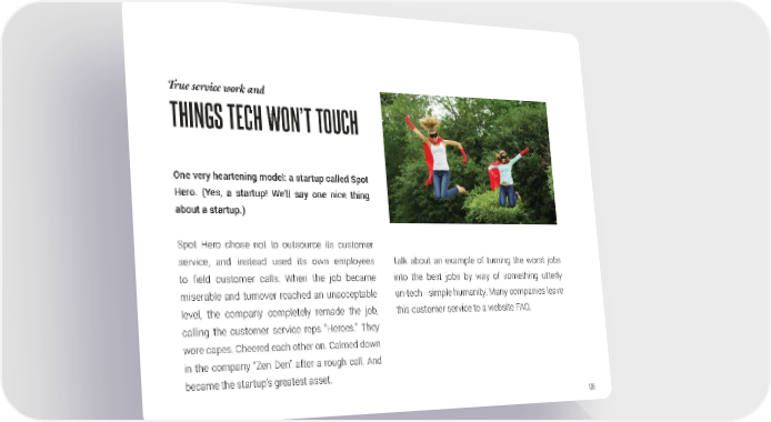 True service work and THINGS TECH WON’T TOUCH One very heartening model: a startup called Spot Hero. (Yes, a startup! We’ll say one nice thing about a startup.) Spot Hero chose not to outsource its customer service, and instead used its own employees Talk about an example of turning the worst jobs to field customer calls. When the job became into the best jobs by way of something utterly miserable and turnover reached an unacceptable un-tech—simple humanity. Many companies leave level, the company completely remade the job, this customer service to a website FAQ. calling the customer service reps “Heroes.” They wore capes. Cheered each other on. Calmed down in the company “Zen Den” after a rough call. And became the startup’s greatest asset. 135
