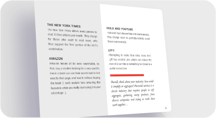 THE NEW YORK TIMES HULU AND YOUTUBE The New York Times allows every person to Hulu and YouTube are free with commercials, read 10 free articles per month. They charge they charge more to partially/entirely avoid for those who want to read more, who those commercials. thus support the ‘free’ portion of the NYT’s contribution. LYFT Attempting to make their rides ‘more free,’ AMAZON Lyft has created Line, which can reduce the Amazon leaves all its texts searchable, so cost of a car ride to something far closer to a that, say, a student looking for a very specific public transit fare. line in a book can use their search tool to find exactly that page, and read it without buying the book (I can’t explain how amazing this Overall, think about your industry: how could feature is when you really start using it to your it simplify or aggregate? Financial services is a advantage…). classic industry that requires people to self- aggregate, gathering many products from diverse companies and trying to make them work together… 115