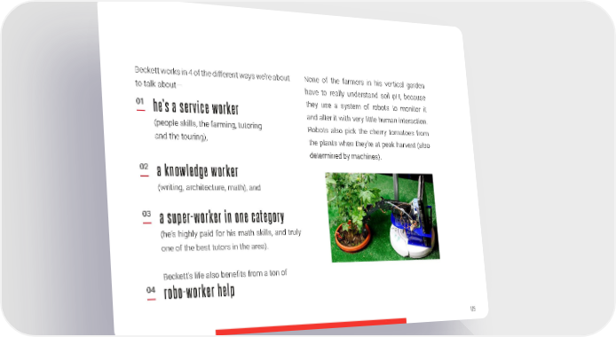 Beckett works in 4 of the different ways we’re about None of the farmers in his vertical garden to talk about— have to really understand soil pH, because 01 he’s a service worker they use a system of robots to monitor it and alter it with very little human interaction. (people skills, the farming, tutoring Robots also pick the cherry tomatoes from and the touring), the plants when they’re at peak harvest (also determined by machines). 02 a knowledge worker (writing, architecture, math), and 03 a super-worker in one category (he’s highly paid for his math skills, and truly one of the best tutors in the area). Beckett’s life also benefits from a ton of 04 robo-worker help 125