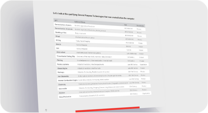 Let’s look at the qualifying General Purpose Technologies that man created before the computer: GPT Spillover Effects Date Classification Domestication of plants Neolithic Agricultural Revolution 9000-8000 BC Process Domestication of animals Neolithic Agricultural Revolution, Working Animals 8500-7500 BC Process Smelting of Ore Early metal tools 8000-7000 BC Process Wheel Mechanization, Potter’s wheel 4000-3000 BC Product Writing Trade, Record keeping 3400-3200 BC Process Bronze Tools & Weapons 2800 BC Product Iron Tools & Weapons 1200 BC Product Water wheel Inanimate power, Mechanical systems Early Middle Ages Product Three-Masted Sailing Ship Discovery of the New World, Maritime Trade, Colonialism 15th Century Product Printing Knowledge economy, Science education, Financial credit 16th Century Process Factory systems Industrial Revolution, Interchangeable arts Late 18th Century Organization Steam Engine Industrial Revolution, Machine Tools Late 18th Century Product Railways Suburbs, Commuting, Flexible location of factories Mid 19th Century Product Iron Steamship Global agricultural trade, International tourism, Dreadnought Battleship Mid 19th Century Product Internal Combustion Engine Automobile, Airplane, Oil Industry, Mobile warfare Late 19th Century Product Electricity Centralized power generation, Factory electrification, Telegraphic communication Late 19th Century Product Automobile Suburbs, Commuting, Shopping Centers, Long-distance domestic tourism 20th Century Product Airplane International tourism, International sport leagues, Mobile warfare 20th Century Product Mass Production Consumerism, Growth of U.S. economy 20th Century Organization 72