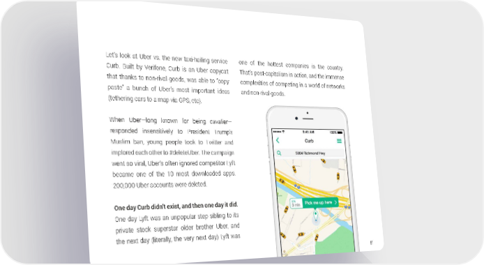 Let’s look at Uber vs. the new taxi-hailing service one of the hottest companies in the country. Curb. Built by Verifone, Curb is an Uber copycat That’s post-capitalism in action, and the immense that thanks to non-rival goods, was able to “copy complexities of competing in a world of networks paste” a bunch of Uber’s most important ideas and non-rival goods. (tethering cars to a map via GPS, etc). When Uber—long known for being cavalier— responded insensitively to President Trump’s Muslim ban, young people took to Twitter and implored each other to #deleteUber. The campaign went so viral, Uber’s often-ignored competitor Lyft became one of the 10 most downloaded apps. 200,000 Uber accounts were deleted. One day Curb didn’t exist, and then one day it did. One day Lyft was an unpopular step sibling to its private stock superstar older brother Uber, and the next day (literally, the very next day) Lyft was 67