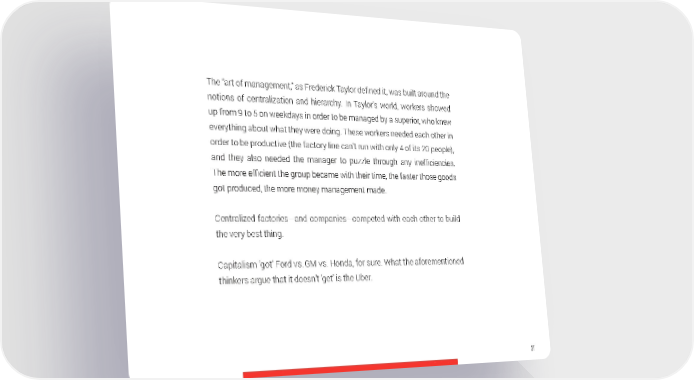The “art of management,” as Frederick Taylor defined it, was built around the notions of centralization and hierarchy. In Taylor’s world, workers showed up from 9 to 5 on weekdays in order to be managed by a superior, who knew everything about what they were doing. These workers needed each other in order to be productive (the factory line can’t run with only 4 of its 20 people), and they also needed the manager to puzzle through any inefficiencies. The more efficient the group became with their time, the faster those goods got produced, the more money management made. Centralized factories—and companies—competed with each other to build the very best thing. Capitalism ‘got’ Ford vs. GM vs. Honda, for sure. What the aforementioned thinkers argue that it doesn’t ‘get’ is the Uber. 37