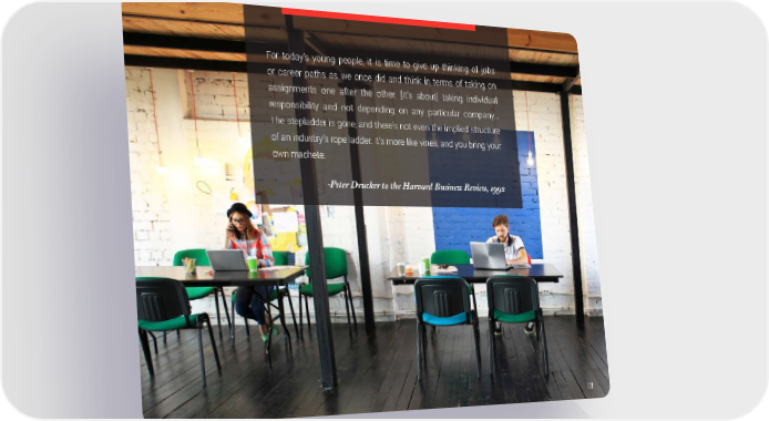 For today’s young people, it is time to give up thinking of jobs or career paths as we once did and think in terms of taking on assignments one after the other. [It’s about] taking individual responsibility and not depending on any particular company… The stepladder is gone, and there’s not even the implied structure of an industry’s rope ladder. It’s more like vines, and you bring your own machete. -Peter Drucker to the Harvard Business Review, 1992 121