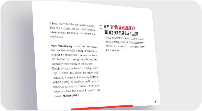 a much more healthy, minimalist solution. 05 WHY HYPER-TRANSPARENCY They can also seize the latest technological WORKS FOR POST-CAPITALISM advancements, like seniors and software that monitor soil. Tech works best when it isn’t used to confuse people/work against the individual or broader Hyper-transparency is another technique, interest. Tech is meant to make things better. and one that’s especially good for industries Use it to do so! plagued by obfuscated business practices, like finance and energy. Industrialization/ capitalism relied heavily on obfuscation. Google Ventures is behind a startup called Digit. It knows that people are terrible with money. So it manages their money for them, without asking. Its goal is to stuff away as much savings as your financial life can bear, before you have the chance to spend it on frivolity. The kids LOVE it. 151