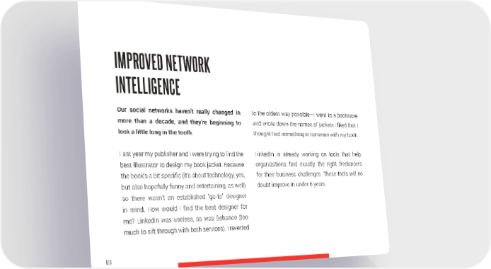 IMPROVED NETWORK INTELLIGENCE Our social networks haven’t really changed in to the oldest way possible—I went to a bookstore more than a decade, and they’re beginning to and wrote down the names of jackets I liked that I look a little long in the tooth. thought had something in common with my book. Last year my publisher and I were trying to find the LinkedIn is already working on tools that help best illustrator to design my book jacket. Because organizations find exactly the right freelancers the book’s a bit specific (it’s about technology, yes, for their business challenges. These tools will no but also hopefully funny and entertaining, as well) doubt improve in under 5 years. so there wasn’t an established “go-to” designer in mind. How would I find the best designer for me? LinkedIn was useless, as was Behance (too much to sift through with both services). I reverted 108