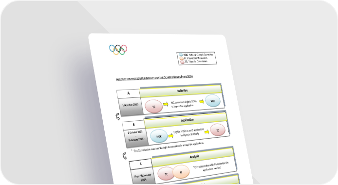 NOC: National Olympic Committee IF: International Federation TC: Tripartite Commission A Invitation TC NOC B Application NOC TC ⃰ C Analysis TC IF D Allocation TC NOC E Confirmation of NOCs NOC NOCs to confirm the allocations TC by sport to the TC Olympic Games Paris 2024 Tripartite Commission Universality Places - Allocation Procedure & Regulations Page 6/6 18 August 2022