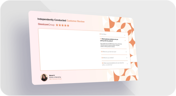 Independently Conducted Customer Review 01 Full Video 02What business problems are you solving with the product? Gain insights into how IMS/Omnicom Group effectively addresses specific business problems using the product, offering practical solutions. 03What do you like the best? 04What do you dislike? 05What recommendations do you have for others considering? Nicole H. Director of Marketing IMS / Omnicom Group