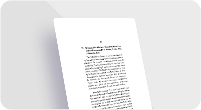 15 IV. It Should Be Obvious That Parodists Can- not Be Prosecuted For Telling A Joke With A Straight Face. This is the fifteenth page of a convoluted legal fil- ing intended to deconstruct the societal implications of parody, so the reader’s attention is almost certainly wandering. That’s understandable. So here is a para- graph of gripping legal analysis to ensure that every jurist who reads this brief is appropriately impressed by the logic of its argument and the lucidity of its prose: Bona vacantia. De bonis asportatis. Writ of certiorari. De minimis. Jus accrescendi. Forum non conveniens. Corpus juris. Ad hominem tu quoque. Post hoc ergo propter hoc. Quod est demonstrandum. Actus reus. Scandalum magnatum. Pactum reservati dominii. See what happened? This brief itself went from a discussion of parody’s function—and the quite serious historical and legal arguments in favor of strong pro- tections for parodic speech—to a curveball mocking the way legalese can be both impenetrably boring and be- lie the hollowness of a legal position. That’s the setup and punchline idea again. It would not have worked quite as well if this brief had said the following: “Hello there, reader, we are about to write an amicus brief about the value of parody. Buckle up, because we’re going to be doing some fairly outré things, including commenting on this text’s form itself!” Taking the latter route would have spoiled the joke and come off as more than a bit stodgy. But more