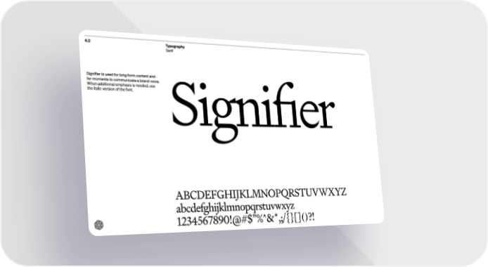 4. 2 Typography Serif Signifier ABCDEFGHIJKLMNOPQRSTUVWXYZ abcdefghijklmnopqrstuvwxyz 1234567890!@#$”%^&*,;/{}[]()?! Signifier is used for long form content and for moments to communicate a brand voice. When additional emphasis is needed, use the italic version of the font .