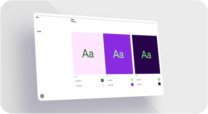 Open AI Brand Book Page 46 Page 483.8 Color Themes Violet Aa Light g r e e n - 8 0 0 v i o l e t - 2 0 0 Aa Mid g r e e n - 4 0 0 v i o l e t - 7 0 0 Aa Dark g r e e n - 5 0 0 v i o l e t - 9 0 0
