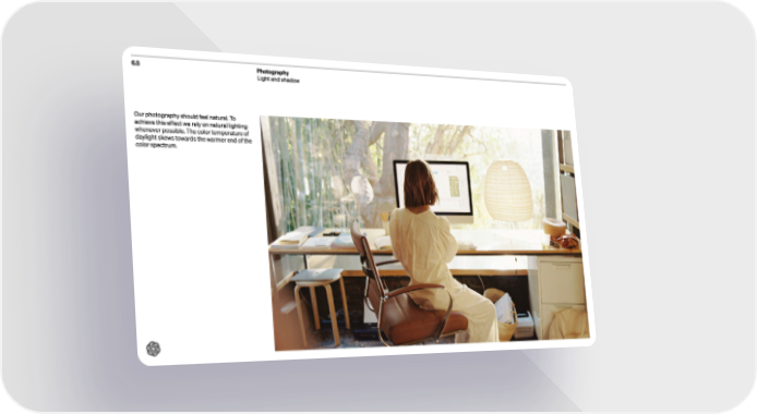 6.5 Photography Light and shadow Our photography should feel natural. To achieve this effect we rely on natural lighting whenever possible. The color temperature of daylight skews towards the warmer end of the color spectrum.