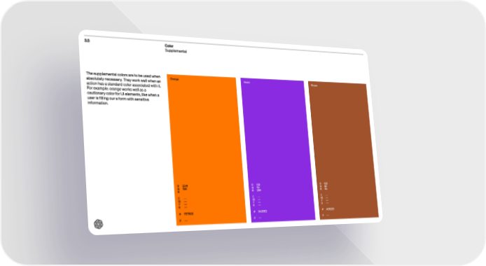 3.5 Color Supplemental R G B 2541 180 C M Y K --- --- --- --- # FE7600 P --- Orange R G B 138 43 226 C M Y K --- --- --- --- # 8A2BE2 P --- Violet R G B 160 82 45 C M Y K --- --- --- --- # A0522D P --- Brown The supplemental colors are to be used when absolutely necessary. They work well when an action has a standard color associated with it . For example: orange works well as a cautionary color for UI elements, like when a user is filling our a form with sensitive information.