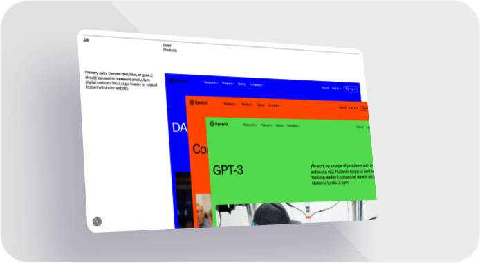 3.8 Color Products Primary color themes (red, blue, or green) should be used to represent products in digital contexts like a page header or related feature within the website. Rese arch Product S afety Company S e arch Log in Sign up DALLĀ·E We work on a range of problems with the goal of achieving AGI. Nullam a turpis ut sem fermentum tincidun endrerit consequat urna in aliquet . Nullam a turpis ut sem. View open roles Rese arch Product S afety Company S e arch Log in Sign up Codex We work on a range of problems with the goal of achieving AGI. Nullam a turpis ut sem fermentum tincidun endrerit consequat urna in aliquet . Nullam a turpis ut sem. View roles Rese arch Product S afety Company S e arch Log in Sign up GPT-3 We work on a range of problems with the goal of achieving AGI. Nullam a turpis ut sem fermentum tincidun endrerit consequat urna in aliquet . Nullam a turpis ut sem.