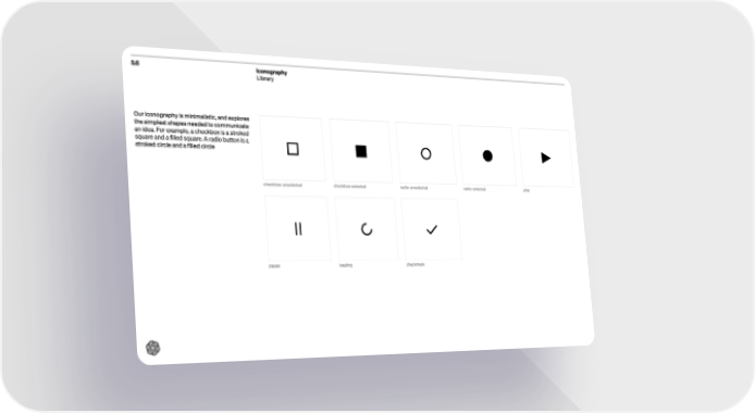 5.6 Iconography Library Our iconography is minimalistic, and explores the simplest shapes needed to communicate an idea . For example, a checkbox is a stroked square and a filled square. A radio button is a stroked circle and a filled circle checkbox-unselected checkbox-selected radio -unselected radio -selected play pause loading checkmark