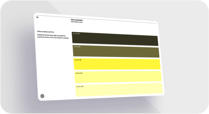 7.5 Data visualization Secondary colors Yellow shades and tints. Shades and tints have been provided for scenarios where more color depth is needed. yellow-900 yellow-800 yellow-400 yellow-200 yellow-100