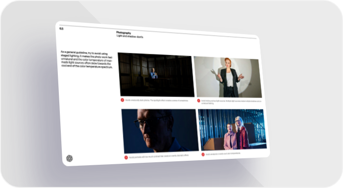 6.5 Photography Light and shadow: dont’s As a general guideline, try to avoid using staged lighting. It makes the photo work feel unnatural and the color temperature of man- made light sources of ten skew towards the cool end of the color temperature spectrum. Avoid unnaturally dark photos. The spotlight ef fect cre ates a sense of une asiness. Avoid por traits with too much contrast that cre ate an over tly dramatic ef fect . Avoid mixing various light sources. Multiple light sources cre ate multiple shadows and an unnatural feeling. Avoid unnatural or overly cool color temperatures.