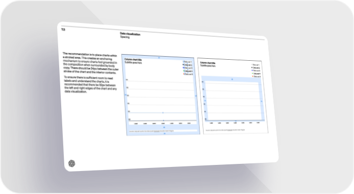 7.3 Data visualization Spacing The recommendation is to place charts within a stroked area . This creates an anchoring mechanism to ensure charts feel grounded in the composition when surrounded by body copy. There should be 24px between the outer stroke of the chart and the interior contents. To ensure there is sufficient room to read labels and understand the charts, it is recommended that there be 32px between the lef t and right edges of the chart and any data visualization. Column char t title Subtitle goes here Data set 1 Data set 2 Data set 3 Data set 4 Data set 5 4 0 00 00 00 00 00 00 1 2 L abel L abel L abel L abel L abel L abel L abel S ource: Aliquam auctor nisi vitae quam tincidunt id auctor lorem fringilla . 3 2 3 2 Column char t title Subtitle goes here 8 Data set 1 4 8 Data set 2 4 8 Data set 3 4 8 Data set 4 4 8 Data set 5 00 00 00 00 00 4 00 4 L abel L abel L abel L abel L abel L abel L abel 4 0 S ource: Aliquam auctor nisi vitae quam tincidunt id auctor lorem fringilla . 2 4 2 4 2 4 2 4