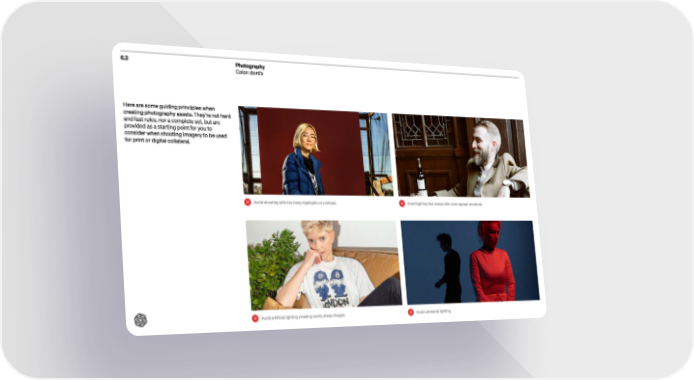 6. 2 Photography Color: dont’s Here are some guiding principles when creating photography assets. They're not hard and fast rules, nor a complete set , but are provided as a starting point for you to consider when shooting imagery to be used for print or digital collateral. Avoid shooting with too many highlights or contrast . Avoid ar tificial lighting cre ating overly sharp images. Avoid lighting that makes skin color appe ar unnatural. Avoid unnatural lighting.