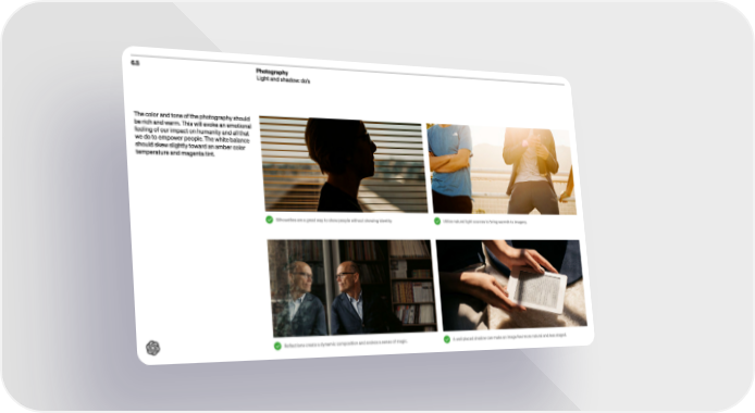 6.5 Photography Light and shadow: do’s The color and tone of the photography should be rich and warm. This will evoke an emotional feeling of our impact on humanity and all that we do to empower people. The white balance should skew slightly toward an amber color temperature and magenta tint . Silhouettes are a gre at way to show people without showing identity Reflections cre ate a dynamic composition and evokes a sense of magic. Utilize natural light sources to bring warmth to imager y. A well placed shadow c an make an image feel more natural and less staged.