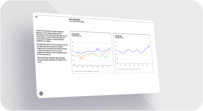 7.9 Data visualization Line charts: Inline labels Labels for line charts can also be placed adjacent to the relevant data sets. Be considerate when taking this approach as too many labels or charts with dense data can quickly feel cluttered, or worse, become illegible for a reader. As a general rule try to only include a maxium of 3 data sets when using inline labels. Alignment for the labels can either be above or below the data set . Use your best judgement based on where available space for the text may be. When showing a singular data set labels should be right-aligned to the edge of the chart . Line char t title Subtitle goes here 00 00 00 00 00 00 01 02 03 04 05 06 07 S ource: Aliquam auctor nisi vitae quam tincidunt id auctor lorem fringilla . Data set 1 Data set 2 Data set 3 Line char t title Subtitle goes here 00 00 00 00 00 00 01 02 03 04 05 06 07 S ource: Aliquam auctor nisi vitae quam tincidunt id auctor lorem fringilla . L abel