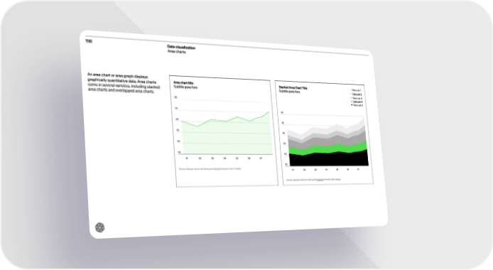 7.10 Data visualization Area charts An area chart or area graph displays graphically quantitative data . Area charts come in several varieties, including stacked area charts and overlapped area charts. Are a char t title Subtitle goes here 00 00 00 00 00 00 01 02 03 04 05 06 07 S ource: Aliquam auctor nisi vitae quam tincidunt id auctor lorem fringilla . S tacked Are a Char t Title Subtitle goes here Data set 1 Data set 2 Data set 3 Data set 4 Data set 5 00 00 00 00 00 00 01 02 03 04 05 06 07 S ource: Aliquam auctor nisi vitae quam tincidunt id auctor lorem fringilla .
