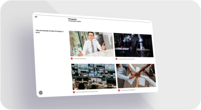6.3 Photography Composition: dont’s Here are examples of types of imagery to avoid. Avoid tilted c amera angles. Avoid busy images with no cle ar subject matter. Avoid images that do not include people. Avoid staged or stock photography.