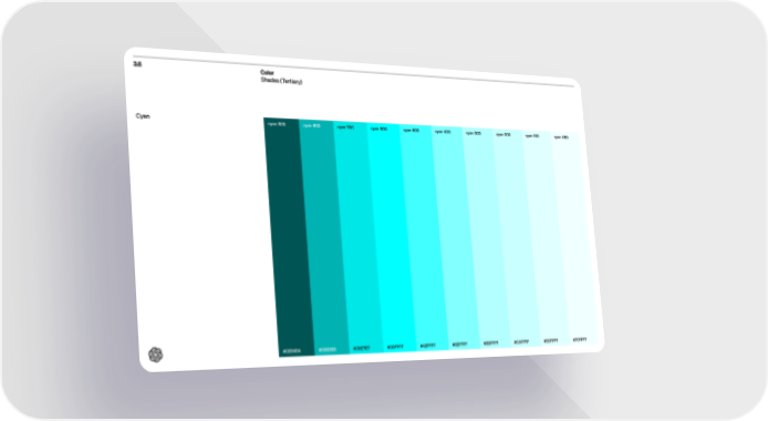 3.6 Color Shades (Tertiary) cyan-900 #005454 cyan- 800 #00B3B3 cyan-700 #00E7E7 cyan- 600 #00FFFF cyan-500 #42FFFF cyan- 400 #82FFFF cyan-300 #B3FFFF cyan-200 #CAFFFF cyan-100 #E0FFFF cyan- 050 #F0FFFF Cyan