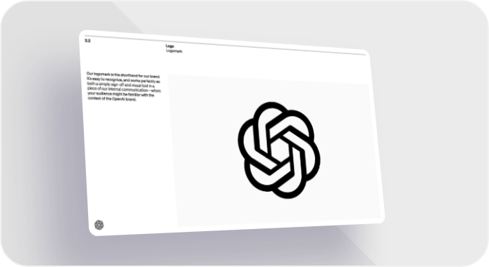 2 . 2 Logo Logomark Our logomark is the shorthand for our brand. It’s easy to recognize, and works perfectly as both a simple sign- off and visual tool in a piece of our internal communication—where your audience might be familiar with the context of the OpenAI brand.