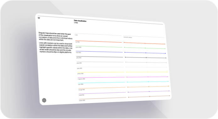 of the visualization is to show an overall correlation of data and when individual values within the data are not important . Lines with markers can be used to show both overall correlation within the data and further highlight specific values within the data . Line stroke width should be 2px and the circular markers should be 8px on digital platforms. red-700 Lines Lines with markers green- 600 blue - 600 gray-900 gray- 600 gray- 400 yellow- 400 magenta-500 cyan- 600 orange - 600 violet-700 brown- 600