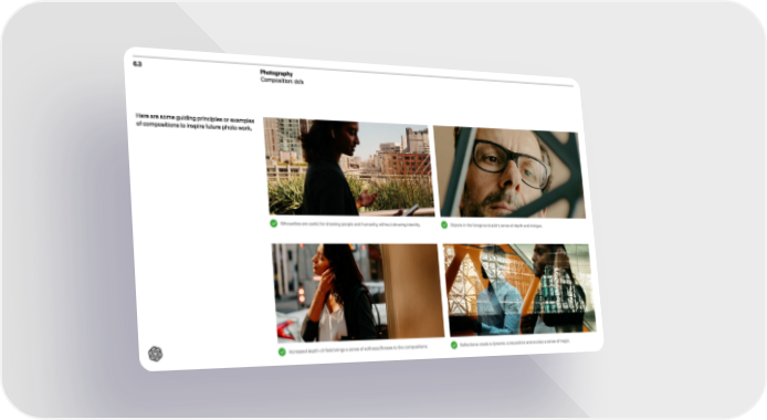 6.3 Photography Composition: do’s Here are some guiding principles or examples of compositions to inspire future photo work. Silhouettes are useful for showing people and humanity, without showing identity. Incre ased depth- of-field brings a sense of sof tness/finesse to the compositions. Objects in the foreground add a sense of depth and intrigue. Reflections cre ate a dynamic composition and evokes a sense of magic.