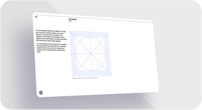 5. 2 Iconography Grid Our iconography system is craf ted on a 16px grid. Be sure to always design your icons based on this grid. Also provided in the diagram to the right is an example of clear space around each glyph, as well as key-lines that should be used to align shapes. For horizontally proportioned icons used the horizontal key-lines provided. For vertically proportioned icons, be sure to align your shapes to the vertically proportioned key- lines. Examples of the 16px grid units, key-lines and margins.