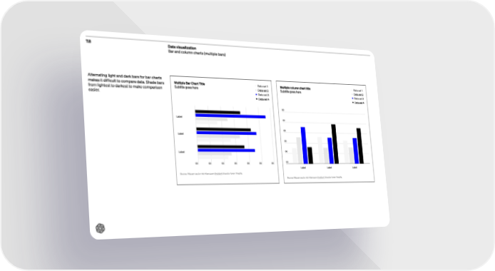 7.8 Data visualization Bar and column charts (multiple bars) Alternating light and dark bars for bar charts makes it difficult to compare data . Shade bars from lightest to darkest to make comparison easier. Multiple Bar Char t Title Subtitle goes here 00 00 00 00 00 00 00 L abel L abel L abel S ource: Aliquam auctor nisi vitae quam tincidunt id auctor lorem fringilla . Data set 1 Data set 2 Data set 3 Data set 4 Multiple column char t title Subtitle goes here Data set 1 Data set 2 Data set 3 Data set 4 00 00 00 00 00 00 L abel L abel L abel S ource: Aliquam auctor nisi vitae quam tincidunt id auctor lorem fringilla .