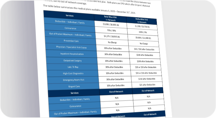 Health Insurance ABC Company is happy to report that there are no changes to the Medical Plans for 2023. We will continue to offer Medical & Prescription Drug insurance though Empire Blue Cross Blue Shield. You will have the choice between two plans, one HSA eligible and one traditional deductible first plan. Both plans are EPO which offer Empire’s National Network, but no out-of-network coverage. st The table below summarizes the medical plans available January 1, 2023 – December 31 , 2023. Services Total Blue HSA Deductible First In Network In Network Deductible – Individual / Family $3,000 / $6,000 (A) $1,500 / $3,750 (E) Coinsurance 70% / 30% 100% / 0% Out of Pocket Maximum – Individual / Family $4,275 / $8,550 (A) $5,000 / $12,000 (E) Preventive Care No Charge No Charge Physician / Specialist Visit Copay 30% after Deductible $35 / $50 after Deductible Inpatient Hospitalization 30% after Deductible $500 after Deductible Outpatient Surgery 30% after Deductible $200 after Deductible Lab / X-Ray 30% after Deductible $35 or $50 after Deductible High-Cost Diagnostics 30% after Deductible $35 or $50 after Deductible Emergency Room Visit 30% after Deductible $150 after Deductible Urgent Care 30% after Deductible $25 after Deductible Services Out-of-Network Out-of-Network Deductible – Individual / Family N/A N/A Coinsurance N/A N/A Out of Pocket Maximum – Individual / Family N/A N/A Services Out-of-Network Out-of-Network Prescription Drugs- Retail/Mail Order Deductible Then: Tier 1 $15 / $30 $10 / $20 Tier 2 $35 / $70 $35 / $70 Tier 3 $75 / $150 $70 / $140 5
