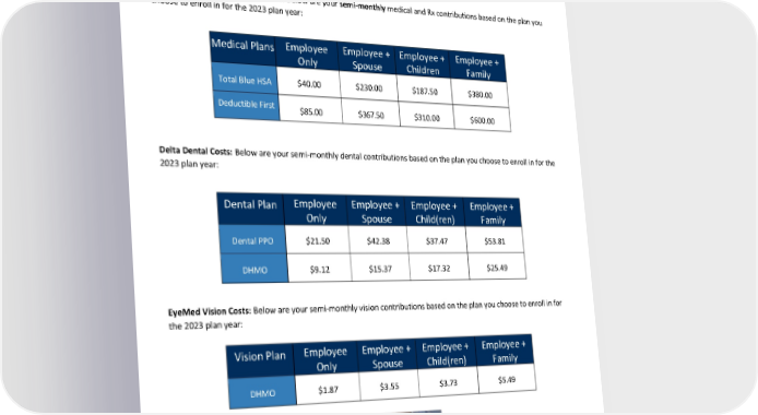 Your Cost in 2023 Below is a summary of your 2023 deductions for the Medical, Dental and Vision plans. Empire Blue Cross Blue Shield Costs: Below are your semi-monthly medical and Rx contributions based on the plan you choose to enroll in for the 2023 plan year: Medical Plans Employee Employee + Employee + Employee + Only Spouse Children Family Total Blue HSA $40.00 $230.00 $187.50 $380.00 Deductible First $85.00 $367.50 $310.00 $600.00 Delta Dental Costs: Below are your semi-monthly dental contributions based on the plan you choose to enroll in for the 2023 plan year: Dental Plan Employee Employee + Employee + Employee + Only Spouse Child(ren) Family Dental PPO $21.50 $42.38 $37.47 $53.81 DHMO $9.12 $15.37 $17.32 $25.49 EyeMed Vision Costs: Below are your semi-monthly vision contributions based on the plan you choose to enroll in for the 2023 plan year: Vision Plan Employee Employee + Employee + Employee + Only Spouse Child(ren) Family DHMO $1.87 $3.55 $3.73 $5.49 19