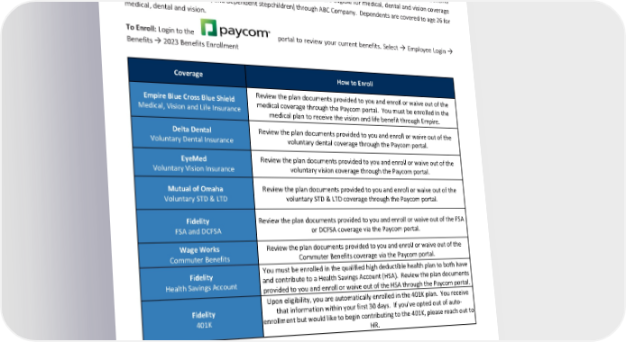 Overview of the Benefits Program If you are a ABC Company full-time employee working 30 or more hours per week, you are eligible to enroll in the benefits described in this guide on your date of hire. The following members are eligible for medical, dental and vision coverage [spouse, dependent children, and dependent stepchildren] through ABC Company. Dependents are covered to age 26 for medical, dental and vision. To Enroll: Login to the portal to review your current benefits. Select → Employee Login → Benefits → 2023 Benefits Enrollment Coverage How to Enroll Empire Blue Cross Blue Shield Review the plan documents provided to you and enroll or waive out of the Medical, Vision and Life Insurance medical coverage through the Paycom portal. You must be enrolled in the medical plan to receive the vision and life benefit through Empire. Delta Dental Review the plan documents provided to you and enroll or waive out of the Voluntary Dental Insurance voluntary dental coverage through the Paycom portal. EyeMed Review the plan documents provided to you and enroll or waive out of the Voluntary Vision Insurance voluntary vision coverage through the Paycom portal. Mutual of Omaha Review the plan documents provided to you and enroll or waive out of the Voluntary STD & LTD voluntary STD & LTD coverage through the Paycom portal. Fidelity Review the plan documents provided to you and enroll or waive out of the FSA FSA and DCFSA or DCFSA coverage via the Paycom portal. Wage Works Review the plan documents provided to you and enroll or waive out of the Commuter Benefits Commuter Benefits coverage via the Paycom portal. Fidelity You must be enrolled in the qualified high deductible health plan to both have Health Savings Account and contribute to a Health Savings Account (HSA). Review the plan documents provided to you and enroll or waive out of the HSA through the Paycom portal. Upon eligibility, you are automatically enrolled in the 401K plan. You receive Fidelity that information within your first 30 days. If you’ve opted out of auto- 401K enrollment but would like to begin contributing to the 401K, please reach out to HR. Open enrollment is running November 10th through November 29th, 2022. The benefits you elect will remain in place from January 1, 2023 – December 31, 2023, unless you have a qualifying event. Examples of a qualifying event include marriage, divorce, legal separation, adoption, or loss of coverage. 4