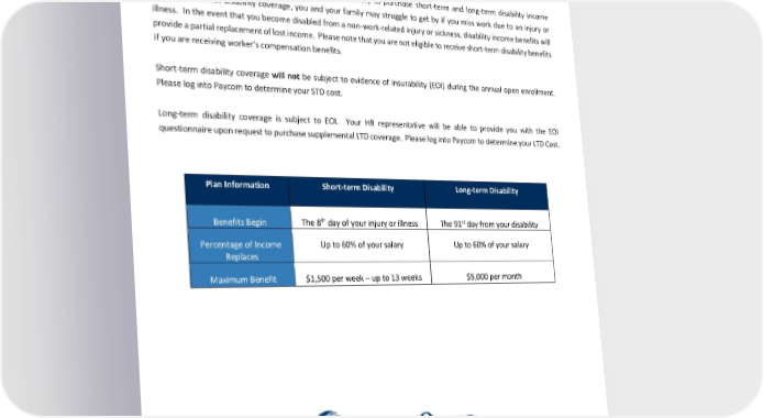 Disability Income Benefits ABC Company provides full-time employees the opportunity to purchase short-term and long-term disability income benefits. Without disability coverage, you and your family may struggle to get by if you miss work due to an injury or illness. In the event that you become disabled from a non-work-related injury or sickness, disability income benefits will provide a partial replacement of lost income. Please note that you are not eligible to receive short-term disability benefits if you are receiving worker’s compensation benefits. Short-term disability coverage will not be subject to evidence of insurability (EOI) during the annual open enrollment. Please log into Paycom to determine your STD cost. Long-term disability coverage is subject to EOI. Your HR representative will be able to provide you with the EOI questionnaire upon request to purchase supplemental LTD coverage. Please log into Paycom to determine your LTD Cost. Plan Information Short-term Disability Long-term Disability th st Benefits Begin The 8 day of your injury or illness The 91 day from your disability Percentage of Income Up to 60% of your salary Up to 60% of your salary Replaces Maximum Benefit $1,500 per week – up to 13 weeks $5,000 per month 17