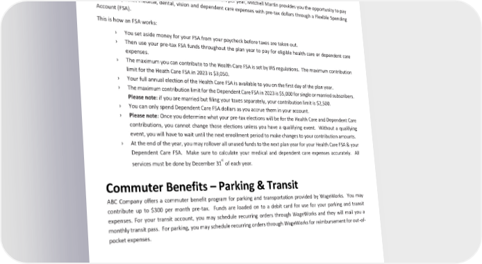 Flexible Spending Account (FSA) Starting January 1, 2023 – the Flexible Spending Account (FSA) will be offered through Fidelity. Once you have completed 2 years of service at 1,000 hours per year, Mitchell Martin provides you the opportunity to pay for out-of-pocket medical, dental, vision and dependent care expenses with pre-tax dollars through a Flexible Spending Account (FSA). This is how an FSA works: › You set aside money for your FSA from your paycheck before taxes are taken out. › Then use your pre-tax FSA funds throughout the plan year to pay for eligible health care or dependent care expenses. › The maximum you can contribute to the Health Care FSA is set by IRS regulations. The maximum contribution limit for the Heath Care FSA in 2023 is $3,050. › Your full annual election of the Health Care FSA is available to you on the first day of the plan year. › The maximum contribution limit for the Dependent Care FSA in 2023 is $5,000 for single or married subscribers. Please note: if you are married but filing your taxes separately, your contribution limit is $2,500. › You can only spend Dependent Care FSA dollars as you accrue them in your account. › Please note: Once you determine what your pre-tax elections will be for the Health Care and Dependent Care contributions, you cannot change those elections unless you have a qualifying event. Without a qualifying event, you will have to wait until the next enrollment period to make changes to your contribution amounts. › At the end of the year, you may rollover all unused funds to the next plan year for your Health Care FSA & your Dependent Care FSA. Make sure to calculate your medical and dependent care expenses accurately. All st services must be done by December 31 of each year. Commuter Benefits – Parking & Transit ABC Company offers a commuter benefit program for parking and transportation provided by WageWorks. You may contribute up to $300 per month pre-tax. Funds are loaded on to a debit card for use for your parking and transit expenses. For your transit account, you may schedule recurring orders through WageWorks and they will mail you a monthly transit pass. For parking, you may schedule recurring orders through WageWorks for reimbursement for out-of- pocket expenses. 8
