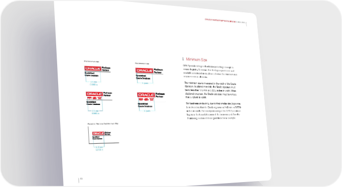 Oracle ParTNerNeTWOrK braNd GuideliNes Minimum size Print Minimum Size Pixel Minimum Size OPN specialized logos should always be large enough to ensure legibility. To ensure that the logo is prominent and readable at reduced sizes, please observe the minimum-size requirements in all media. 17.5 mm 57 pixels The minimum size is measured by the width of the Oracle 0.6965 in signature. in printed materials, the Oracle signature must be no less than 17.5 mm or 0.6965 inches in width. When displayed onscreen, the Oracle signature must be no less than 57 pixels in width. For business cards only, due to their smaller size, logos may be reduced so that the Oracle signature is 14.5 mm or 0.5709 17.5 mm 57 pixels inches in width. Preferred positioning of the OPN specialized 0.6965 in logo is in the lower-left corner of the business card. see the Positioning section of these guidelines for an example. exception: business card Minimum Size 14.5 mm 0.5709 in 18