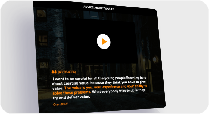ADVICE ABOUT VALUES 1. Domestic & General started out over 100 years ago, ensuring cattle and sheep rights. So not long after the Titanic went down there was a need all of a sudden to have protection and insurance on your livestock. (48:58-49:!6) I want to be careful for all the young people listening here about creating value, because they think you have to give value. The value is you, your experience and your ability to solve these problems. What everybody tries to do is they try and deliver value. Oren Klaff