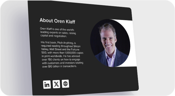 About Oren Klaff Oren Klaff is one of the world's leading experts on sales, raising capital and negotiation. His first book, Pitch Anything, is required reading throughout Silicon Valley, Wall Street and the Fortune 500, with more than 1,000,000 copies in print worldwide. He has advised over 150 clients on how to engage with customers and investors totaling over $10 billion in transactions.