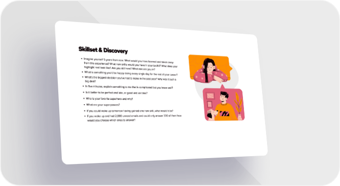 Skillset & Discovery Imagine yourself 5 years from now. What would you have learned and taken away from this experience? What new skills would you have in your toolkit? What does your highlight reel look like? Are you still here? What role are you in? What is something you'd be happy doing every single day for the rest of your career? What's the biggest decision you've had to make in the past year? Why was it such a big deal? In five minutes, explain something to me that is complicated but you know well? Is it better to be perfect and late, or good and on time? Who is your favorite superhero and why? What are your superpowers? If you could wake up tomorrow having gained one new skill, what would it be? If you woke up and had 2,000 unread emails and could only answer 300 of them how would you choose which ones to answer?
