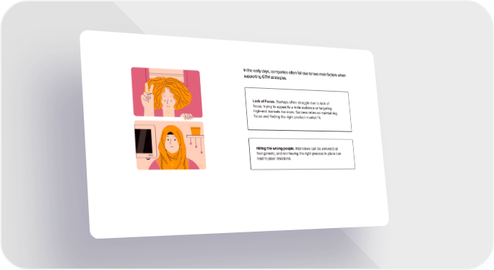 In the early days, companies often fail due to two main factors when supporting GTM strategies. Lack of Focus. Startups often struggle due to lack of focus, trying to appeal to a wide audience or targeting high-end markets too soon. Success relies on maintaining focus and finding the right product-market fit. Hiring the wrong people. Interviews can be awkward or feel generic, and not having the right process in place can lead to poor decisions.