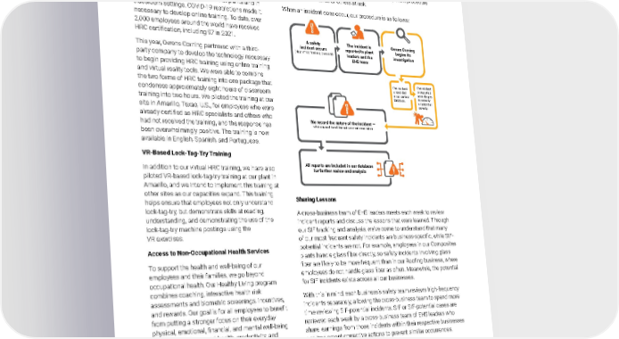 2021 Owens Corning Sustainability Report | Expanding Our Social Handprint | Living Safely | 251 Hazard Recognition and Control (HRC) Programs Spotting hazards is a learned skill, and the HRC program teaches employees to break the human tendency to overlook familiar objects and situations, which can cause people to miss risks. Through the program, employees learn specific techniques to identify hazards, quantify risks, and develop effective ways to minimize or eliminate them. Traditionally, HRC training has been conducted at plants and in classroom settings. COVID-19 restrictions made it necessary to develop online training. To date, over 2,000 employees around the world have received HRC certification, including 97 in 2021. This year, Owens Corning partnered with a third- party company to develop the technology necessary to begin providing HRC training using online training and virtual reality tools. We were able to combine the two forms of HRC training into one package that condenses approximately eight hours of classroom training into two hours. We piloted the training at our site in Amarillo, Texas, U.S., for employees who were already certified as HRC specialists and others who had not received the training, and the response has been overwhelmingly positive. The training is now available in English, Spanish, and Portuguese. VR-Based Lock-Tag-Try Training In addition to our virtual HRC training, we have also piloted VR-based lock-tag-try training at our plant in Amarillo, and we intend to implement this training at other sites as our capacities expand. This training helps ensure that employees not only understand lock-tag-try, but demonstrate skills at reading, understanding, and demonstrating the use of the lock-tag-try machine postings using the VR exercises. Access to Non-Occupational Health Services To support the health and well-being of our employees and their families, we go beyond occupational health. Our Healthy Living program combines coaching, interactive health risk assessments and biometric screenings, incentives, and rewards. Our goal is for all employees to benefit from putting a stronger focus on their everyday physical, emotional, financial, and mental well-being — resulting in improved health, productivity, and happiness. Read more about the program in the Health & Wellness chapter . This year, the company continued to promote the company-provided resources available to support employees’ health and well-being throughout the COVID-19 pandemic. For quantitative occupational health and safety performance metrics for full-time employees and contractors, please see Appendix B. Safety Strategies at Owens Corning Incident Reporting and Investigations Our policy states that employees are expected to insist on safety training before starting any job or task. As a result, employees are also expected to stop and report unsafe behavior or any work procedure that puts themselves or others at risk. When an incident does occur, our procedure is as follows: A saf ety incident occurs (Near miss, first aid, or injury ) The incident is repo rted to plant leaders and the EHS team Owens Corning begins its investigation The incident is recorded in our centr al database. The incident is classified according to its severity or potential severity . We record the nature of the incident — what caused it and the actions that were taken. All repo rts are included in our database for fu rther review and analysis Sharing Lessons A cross-business team of EHS leaders meets each week to review incident reports and discuss the lessons that were learned. Through our SIF tracking and analysis, we’ve come to understand that many of our most frequent safety incidents are business-specific, while SIF- potential incidents are not. For example, employees in our Composites plants handle glass fiber directly, so safety incidents involving glass fiber are likely to be more frequent than in our Roofing business, where employees do not handle glass fiber as often. Meanwhile, the potential for SIF incidents exists across all our businesses. With this in mind, each business’s safety team reviews high-frequency incidents separately, allowing the cross-business team to spend more time reviewing SIF-potential incidents. SIF or SIF-potential cases are reviewed each week by a cross-business team of EHS leaders who share learnings from those incidents within their respective businesses and implement corrective actions to prevent similar occurrences. At the local level, incidents are reviewed during each shift’s daily meeting. These meetings, which are a regular part of our operations, are an opportunity for the team to share and discuss topics ranging from plant production metrics to participation in health and wellness activities. The incoming workers are briefed on current working conditions, including safety concerns or investigations that are in progress, and they have the opportunity to ask questions and provide suggestions.
