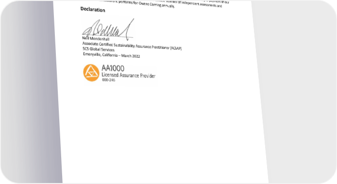 © SCS Global Services Page 5 of 5 Independence SCS Global Services is an independent and internationally accredited conformance assessment b ody. All members of the assurance team were internally reviewed to ensure they were free from conflicts of interest. SCS is not financial ly dependen t on Owens Corning in any way beyo nd the pre -payment of our work under the scope of this engagement and a limited number of independent assessments and product cert ifications it performs for Owens Corning annually . Declaration __________________________ Neil Mendenhall Associate Certified Sustainability Assurance Practitioner (ACSAP) SCS Global Services Emeryville, California – March 202 2 2021 Owens Corning Sustainability Report | Appendices | 349 ASSURANCE STATEMENT Appendix F