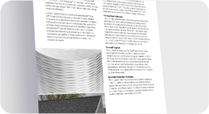 2021 Owens Corning Sustainability Report | Expanding Our Product Handprint | Product Innovation & Stewardship | 98 Photos: Top: Windstrand ® composite material. Bottom: TruDefinition ® Duration ® COOL Plus Shingles in Midnight. Composites Innovations WindStrand ® This innovative material allows wind blade manufacturers to use 30% fewer layers of material in the blade molds, while delivering the same quality and performance as standard fabrics. This in turn represents a 50% savings in labor and production time for the blades. In March 2021, we introduced WindStrand ® 4000, as well as Ultrablade ® 2 and Ultraspar™ 2, three high-performance materials that help wind blade manufacturers develop longer, stiffer, stronger blades. This in turn helps make wind energy more cost-effective. In 2021, Owens Corning introduced ArmaStrand™ Type 30 ® Single-End Roving product into the Russian market. This product is specifically designed to provide customers with productivity savings while increasing the service life of rebar. Using corrosion-resistant Advantex ® glass fiber, ArmaStrand™ has the flexibility to be used in a variety of rebar manufacturing processes and maximizes the mechanical properties of rebar systems with increased fiber content and higher bar modulus to meet new industry demands. Roofing Innovations Duration FLEX ® The only modified polymer asphalt shingle with SureNail ® technology, with nearly 1.5x the nail-pull strength and 10% better strength than standard shingles, Duration FLEX ® also features improved granular adhesion and meets the highest impact resistance rating. After a successful launch in the U.S., Owens Corning developed a version specifically for the Canadian market. In 2021 Owens Corning continued to promote Duration FLEX ® in Canada to allow customers to access a version of Duration FLEX ® that meets CSA 123.5 standards as well as UL 2218 Class 4 impact resistance. The Cool Roof Collection Using a highly reflective granule technology that reflects the sun’s rays, Cool Roof shingles help reduce energy use by keeping roofs cooler and reducing air conditioning energy levels. Owens Corning offers a wide array of shingle choices that meet or exceed an aged SRI of 20 — the current aged Solar Reflectance Index minimum required for the Green Building Standards Code of Los Angeles County and Los Angeles City Cool Roofs Ordinance. In 2021, Owens Corning launched Duration ® COOL Plus Midnight color providing a new dark color offering in this energy saving line. Trumbull ® Asphalt Over the last six years, our Trumbull ® asphalt has made significant strides to reduce the number of oxidized products we produce for external asphalt markets. In 2015, 8% of our products were non-oxidized. Today, approximately 50% of the products we produce for the external asphalt business are non-oxidized, requiring less energy, lower temperatures, and fewer emissions. This has resulted in a 3% improvement in material efficiency across the 12 asphalt plants in the network. Recyclable Protective Packaging The European Union’s policy requires all plastic packaging in the EU market to be recyclable or reusable by 2030 to support the transition to a circular economy. Owens Corning is partnering with key players in lumber and steel to develop solutions through our expertise in polymer streams, with a goal of achieving these solutions by 2025.