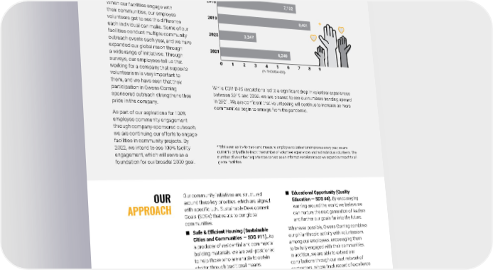 2021 Owens Corning Sustainability Report | Expanding Our Social Handprint | Community Engagement | 234 By 2030, 100% of our employees will be actively engaged in their communities through company- sponsored activities. When our facilities engage with their communities, our employee volunteers get to see the difference each individual can make. Some of our facilities conduct multiple community outreach events each year, and we have expanded our global reach through a wide range of initiatives. Through surveys, our employees tell us that working for a company that supports volunteerism is very important to them, and we have seen that their participation in Owens Corning sponsored outreach strengthens their pride in the company. As part of our aspirations for 100% employee community engagement through company-sponsored outreach, we are continuing our efforts to engage facilities in community projects. By 2022, we intend to see 100% facility engagement, which will serve as a foundation for our broader 2030 goal. Our community initiatives are structured around three key priorities, which are aligned with specific U.N. Sustainable Development Goals (SDGs) that relate to our global communities. ■ Safe & Efficient Housing (Sustainable Cities and Communities — SDG #11). As a producer of residential and commercial building materials, we are well-positioned to help those who are unable to obtain shelter through traditional means. ■ Basic Health & Wellness (Good Health and Well-being — SDG #3 / Clean Water and Sanitation — SDG #6). We seek to extend our culture of wellness beyond the workplace and into the communities where we serve. ■ Educational Opportunity (Quality Education — SDG #4). By encouraging learning around the world, we believe we can nurture the next generation of leaders and further our goals far into the future. Whenever possible, Owens Corning combines our philanthropic activity with volunteerism among our employees, encouraging them to be fully engaged with their communities. In addition, we are able to extend our contributions through our vast network of contractors, whose track record of excellence offers an added advantage as we seek to advance our efforts. 2030 GOALS FOR COMMUNITY ENGAGEMENT OUR APPROACH Number of Volunteer Experiences* * While our ability to track and measure employee volunteerism improves every year, we are currently only able to track the number of volunteer experiences and not individual volunteers. The number of volunteer experiences serves as an informative reference as we expand our reach to all global facilities. While COVID-19 restrictions led to a significant drop in volunteer experiences between 2019 and 2020, we are pleased to see our numbers trending upward in 2021. We are confident that volunteering will continue to increase as more communities begin to emerge from the pandemic.