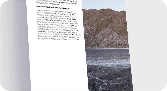 2021 Owens Corning Sustainability Report | Reducing Our Environmental Footprint | Waste Management | 182 Briquette Production Briquetting refers to the compression of industrial scrap and other byproducts. In their compacted shape, these briquettes can be reused as input material for cupolas in our operations. At several of our mineral wool sites, scrap rockwool and other byproducts are being converted into briquettes. Although most of the briquettes are manufactured by third-party companies, our facility in Guangde, China, built a brick workshop in 2019. Briquettes made there are fed back into the cupola; this solution for production waste helps the facility send zero waste to landfill. Reducing Sludge from Wastewater Treatment In recent years, we have had notable initiatives reducing process-related and wastewater treatment sludge and increasing recycling of fly ash and shot, which we continue to work at expanding. In 2021, we diverted 25% of sludge from the landfill, up from 13% in 2010. Our facility in Taloja, India, is investigating the use of sludge from the wastewater treatment process for use in cement. Our Yuhang, China, plant is focused on reducing sludge by improving binder application efficiency and reducing moisture content through dewatering. The sludge recycling program at our plant in Besana, Italy, has continued to increase volume. Our Kimchon, South Korea, facility is recycling all their sludge through two outlets, and they stopped sending sludge to landfill in 2018. Photo submitted by: Jan-Christian Stenroos | Parainen, Finland Raw material at the Paroc plant in Parainen, Finland.
