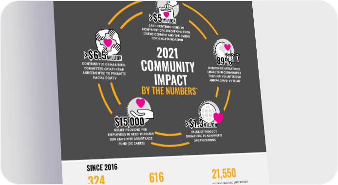 2021 Owens Corning Sustainability Report | Expanding Our Social Handprint | Community Engagement | 238 COMMUNITY ENGAGEMENT INITIATIVES new roofs provided to veterans in need through the Roof Deployment Project 324 home builds, renovations, or improvements in the U.S., Canada, and China through Habitat for Humanity International 616 children provided with access to computers 21,550 individuals provided with access to clean water 3,035 meals packed and served globally by Owens Corning volunteers 1,168,442 hygiene or supply kits packed 58,768 SINCE 2016 Our people and our products make the world a better place — we see that in action as we look at the impact of our employee volunteers, our in-kind donations, and the financial support of the Owens Corning Foundation. CONTRIBUTED OR HAS BEEN COMMITTED (MULTI-YEAR AGREEMENTS) TO PROMOTE RACIAL EQUITY CASH CONTRIBUTIONS TO NONPROFIT ORGANIZATIONS FROM OWENS CORNING AND THE OWENS CORNING FOUNDATION WORLDWIDE OPERATIONS ENGAGED IN COMMUNITIES THROUGH VOLUNTEERISM AND/OR COVID-19 RELIEF RELIEF PROVIDED FOR EMPLOYEES IN NEED THROUGH OUR EMPLOYEE ASSISTANCE FUND (OC CARES) VALUE OF PRODUCT DONATIONS TO NONPROFIT ORGANIZATIONS $15,000 $15,000 >$1.3 >$1.3 MILLION MILLION >$6.5 >$6.5 MILLION MILLION >$5 >$5 MILLION MILLION 89% 89% 2021 COMMUNITY IMPACT BY THE NUMBERS +